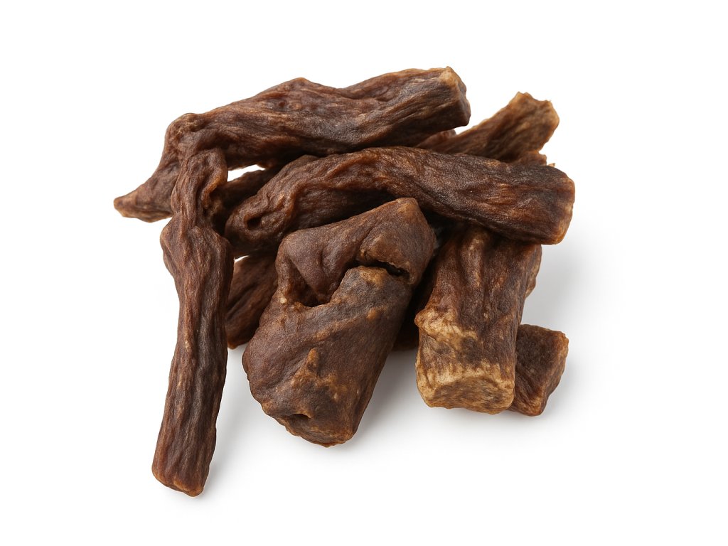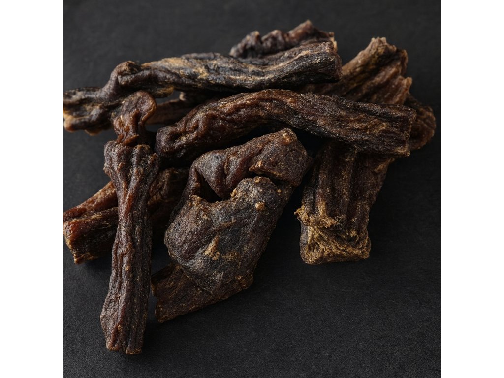 Beef Jerky predstavuje sušené mäso. Naše hovädzie sušené mäso pre psov je bohaté na bielkoviny a prirodzený žuvací zážitok. Ideálne pre odmenu, čistí zuby alebo jednoduchý spôsob, ako potešiť vášho psa. Zdravá radosť v každom kúsku!