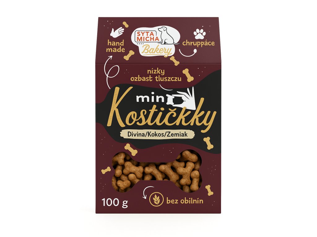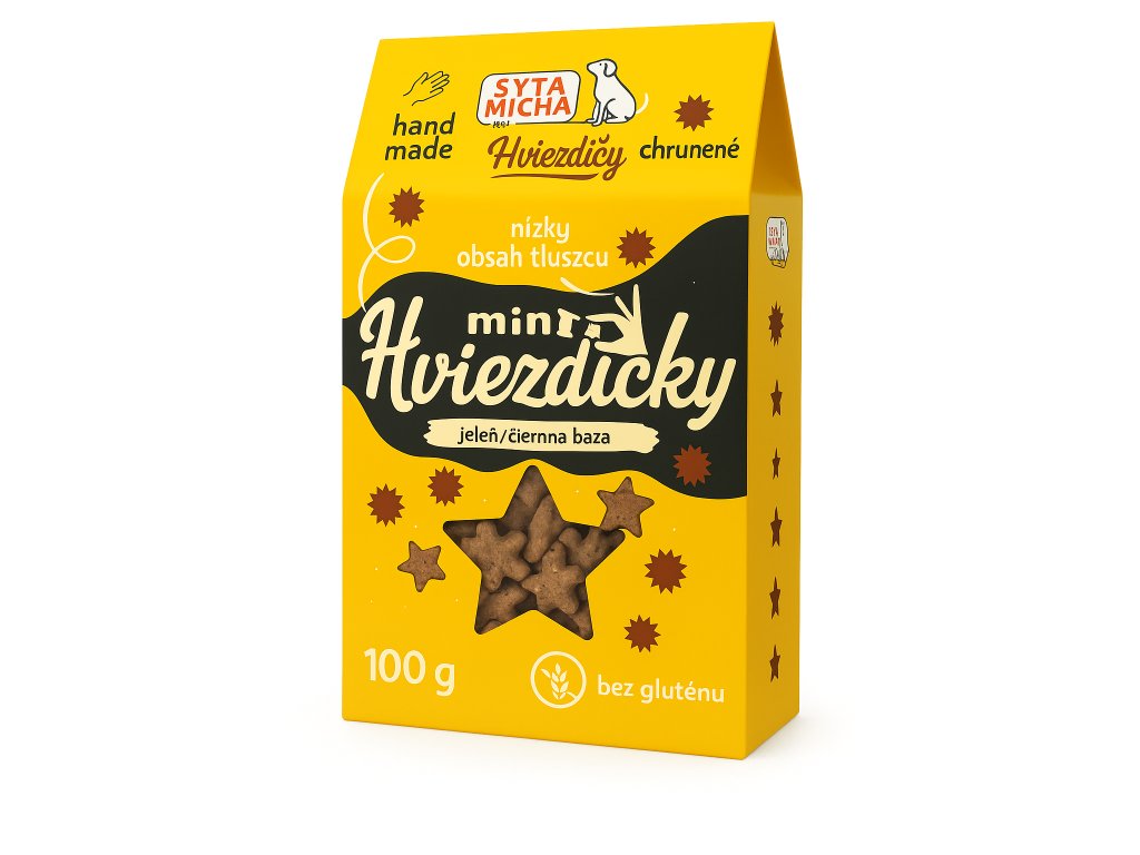Syta Micha Bakery Mini sušienky sú ručne pečené dobroty v tvare hviezdičiek alebo kostičiek, ktoré si psy zamilujú. Vyrábané z jeleniny, ovocia a byliniek – bez obilnín, soli či pridaného cukru.