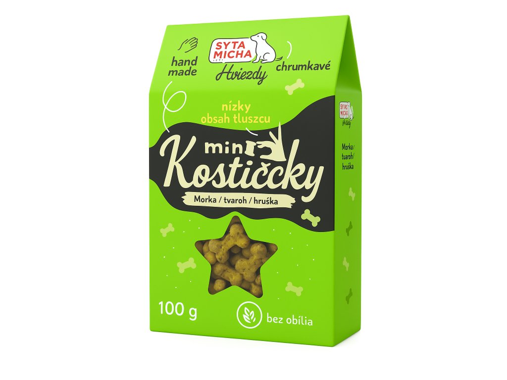 Mini Kostičky: zemiakové vločky, zemiaková múka, čerstvé morčacie mäso (15 %), čerstvý nízkotučný tvaroh (5 %), mleté ľanové semienko (5 %), sušená mrkva (4 %), sušená hruška (4 %), celulóza (1,5 %), prášok z vaječných škrupín (1 %), chia semienka (1 %), zeleninový vývar, med (1 %), provensálske bylinky (1 %), kurkuma (0,5 %).